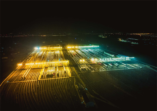 9月3日,一列中欧班列通过内蒙古二连浩特铁路口岸入境(无人机照片)。