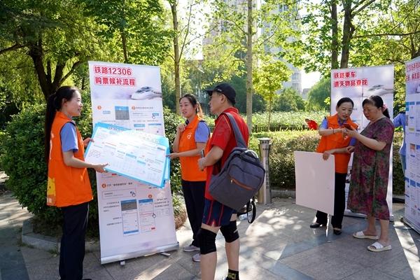 8月4日,中国铁路上海局集团有限公司淮南西站团委组织青年志愿者走进安徽省淮南市田家庵区龙泉街道基地社区开展“智慧铁路进社区”活动。青年志愿者通过图片讲解、现场演示等方式,向老人宣传12306App使用、铁路乘车知识和服务站线下预约等内容。付岩果/摄