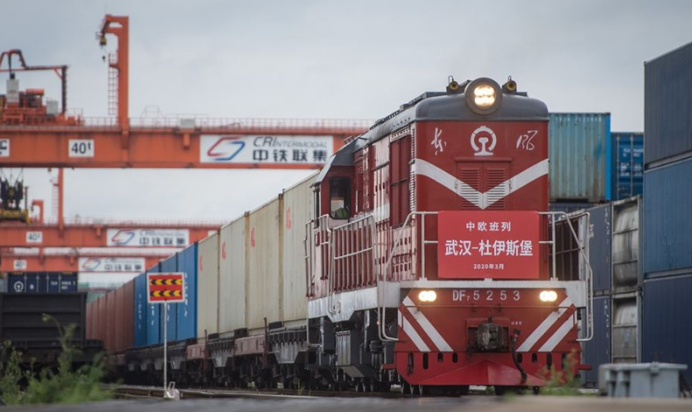 A China-Europe freight train bound for Duisburg of Germany pulls out of the Wuhan terminal of China Railway Intermodal in Wuhan, central China's Hubei P...