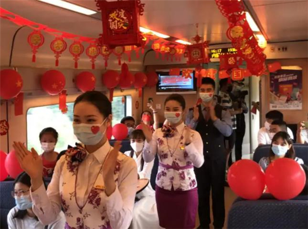 在布满红色气球、灯笼和窗花妆点的车厢,旅客们挥舞着手中的五星红旗共同高歌欢唱祖国,歌声、掌声、欢笑声久久回荡……这里是成都客运段首发雅安到重庆北直达动车...