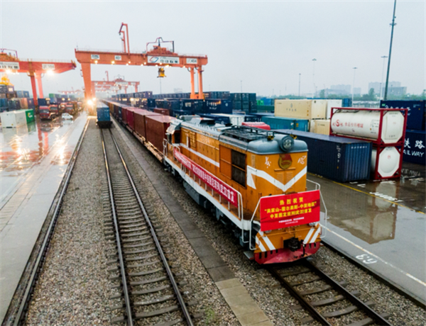 4月12日清晨,中亚班列(武汉)实现常态化开行的首趟班列X9011次,装载湖北省及华东、华南地区的石材、卷钢、瓷砖、空调等物资,从中国铁路武汉局集团有限公司(下...